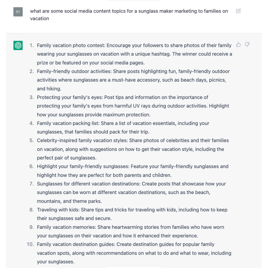 Say you sell sunglasses, you could ask give me content topics for sunglasses